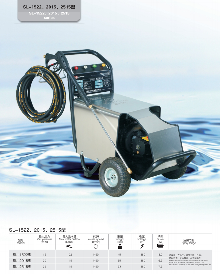 上海神龍集團(tuán)生產(chǎn)的高壓清洗機(jī)SL-1522、2015、2515型高壓清洗機(jī),適用洗車場、汽修廠、建筑工地、外墻、防疫消毒、小區(qū)物業(yè)、工礦企業(yè)等。