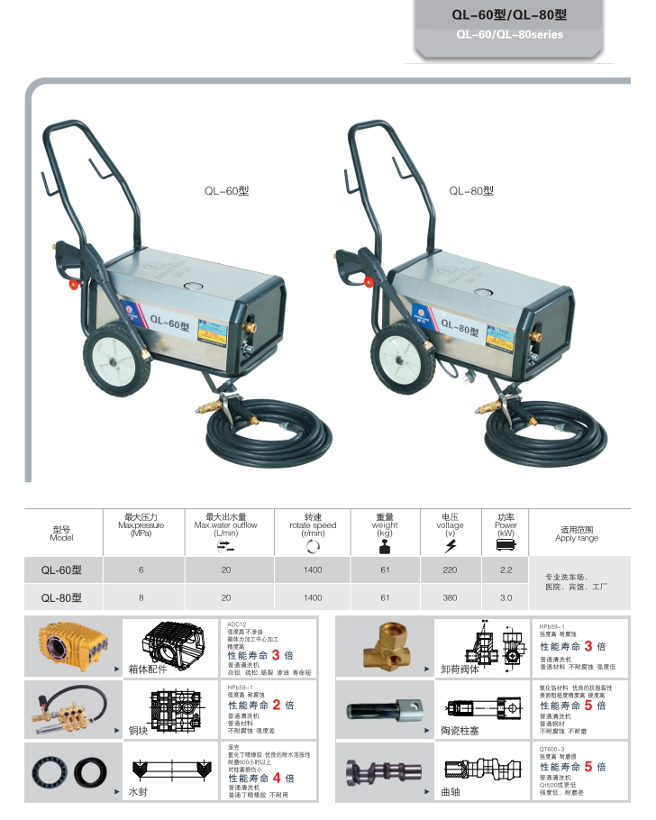 上海神龍集團生產的高壓清洗機QL-60型/QL-80型清洗機,適用洗車場、汽修廠、建筑工地、外墻、防疫消毒、小區物業、工礦企業等。